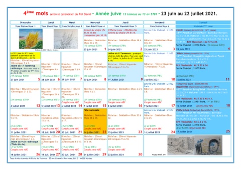 4 ème mois selon le calendrier du Roi David - Année juive 13 tamouz au 13 av 5781 - 23 juin au 22 juillet 2021.