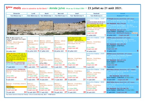 5 ème mois selon le calendrier du Roi David - Année juive 14 av au 13 éloul 5781 - 23 juillet au 21 août 2021.