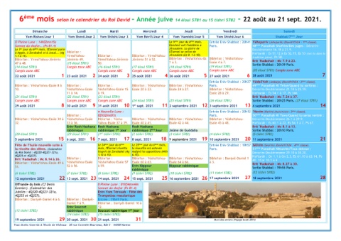 6 ème mois selon le calendrier du Roi David - Année juive 14 éloul 5781 au 15 tishri 5782 - 22 août au 21 sept. 2021.