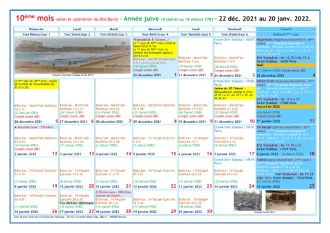 10 ème mois selon le calendrier du Roi David - Année juive 18 thévèt au 18 shévat 5782 - 22 déc. 2021 au 20 janv. 2022.