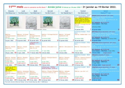 11 ème mois selon le calendrier du Roi David - Année juive 19 shévat au 18 adar 5782 - 21 janvier au 19 février 2022.