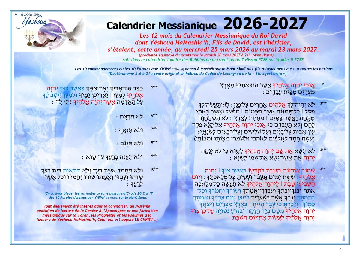 Le Calendrier Messianique du Roi David, dont, Yéshoua est l’héritier commence le mercredi 26 mars 2026 pour une année spirituelle nouvelle avec YHWH (l’Éternel), notre Élohim (Dieu), l’Élohim (Dieu) d’Avraham, de Yits’haq et de Yaâqov. Yéshoua, Celui qui est appelé LE CHRIST et ses disciples l’utilisait en leur temps. Yéshoua était appelé le “Fils de David”, ainsi que l’aveugle de Jéricho le criait au milieu de la foule : « Aie pitié de nous, Fils de David…”?