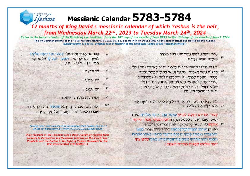 This King’s David Messianic Calendar, which Yeshua is the heir, now exists in French and in English. It will soon be available in Spanish and then, step by step, in other languages… according to what YHWH (The Everlasting), our Elohim (God), our Father will allow us to do. Be blessed…