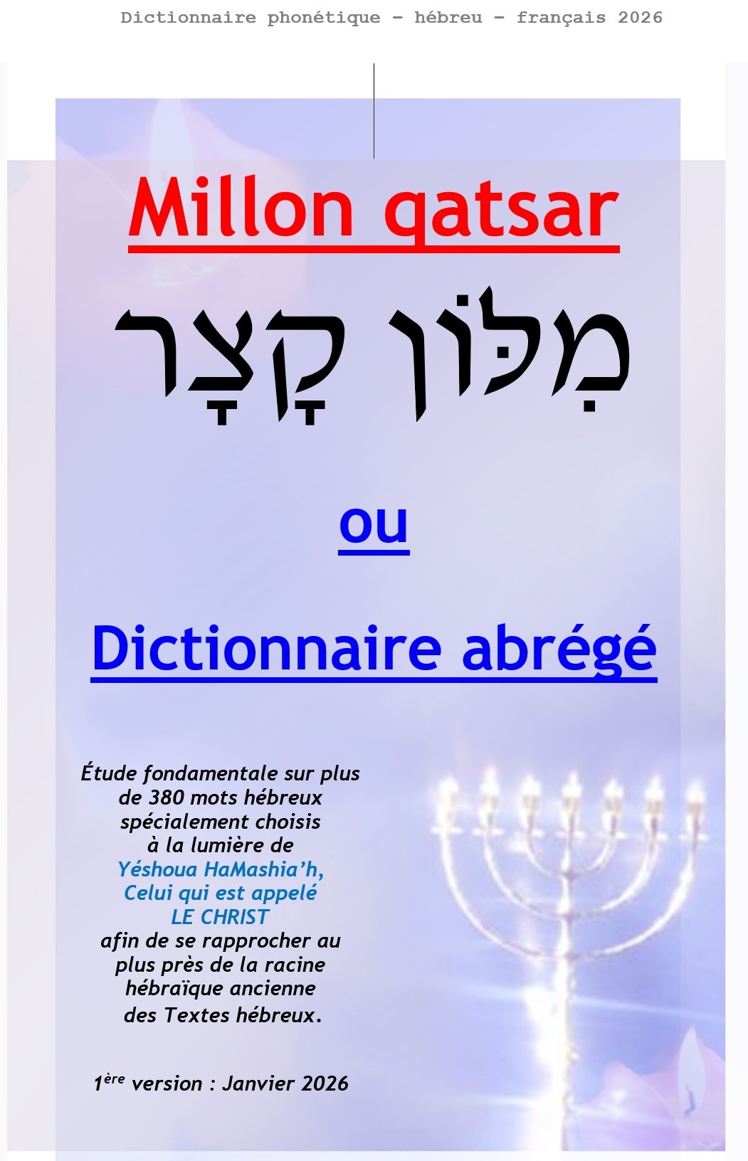Le but principal de ce Million qatsar ou dictionnaire abrégé à la lumière de Yéshoua, est de découvrir les Textes hébreux au plus près des racines hébraïques. On y trouvera non seulement la signification profonde des mots hébreux en regard des racines hébraïques anciennes pour la plupart d’entre eux mais aussi tous les versets de la Bible où ces mots sont utilisés. Cet ouvrage devrait donc permettre à tout Croyant qui le veut, de pouvoir corriger tel ou tel verset dans toutes les Écritures… Le Million qatsar version janvier 2026 au format A4 (21cm x 29,7 cm) est proposé à 30 euros + 12 euros de frais de port pour la France métropolitaine.