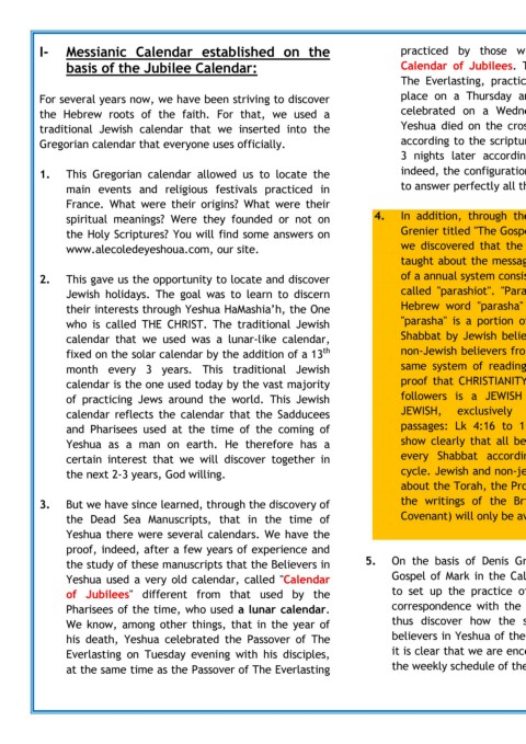 I- Messianic Calendar established on the practiced by those who followed this famous This was inevitable because the 1 century believers