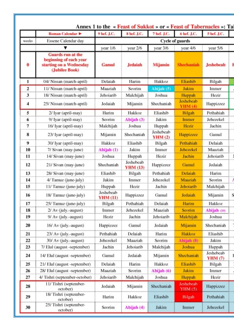 Annex 1 to the « Feast of Sukkot » or « Feast of Tabernacles »: Table of the « priestly guards » of the Temple at the time of Yeshua