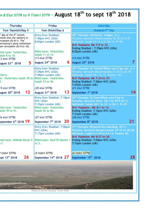 6 month according to the Jubilees calendar –Jewish year from 8 Elul 5778 to 9 Tishri 5779 – August 18 to sept 18 2018