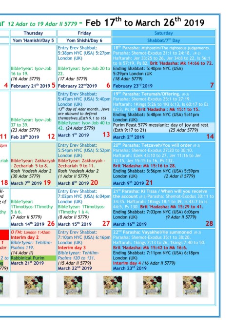 12 month according to the Jubilees calendar - Jewish year 12 Adar to 19 Adar II 5779 - Feb 17 to March 26 2019
