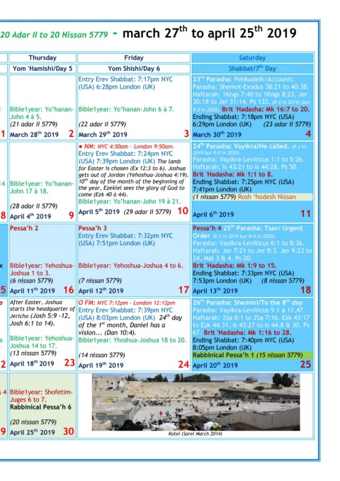 Pessa‟h 5 (holiday) Pessa‟h 6 Pessa‟h 7 (holiday) Crossin the Read Sea on the After Easter, Joshua O FM: NYC 7:12pm - London 12:12pm 26 Parasha: Shemini/To the 8 day