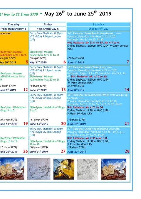 according to the Jubilees 11:01am NYC (USA) 9:13pm London Parasha: Bamidbar-Numbers 4:21 to 7:89.