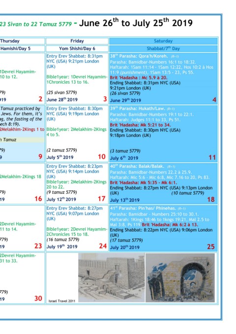 5 day of the 4 month, ● NM: NYC 3:16pm - Fasting of 9 Tamuz practiced by Entry Erev Shabbat: 8:30pm 39 Parasha: Hukath/Law. (R+1)