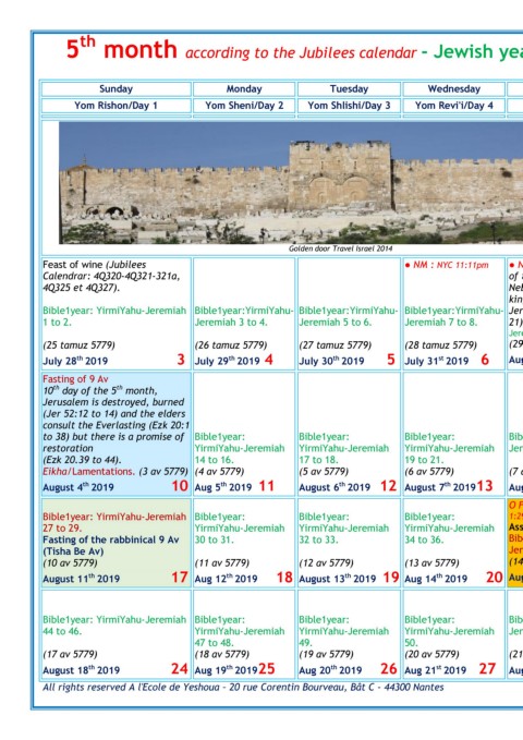 5 month according to the Jubilees calendar - Jewish year 23 Tamuz to 23 Av 5779 - July 26 to August 24 2019