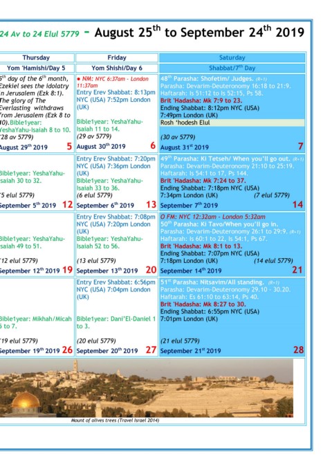 1 day of the 6 month, The 5 day of the 6 month, ● NM: NYC 6:37am - London 48 Parasha: Shofetim/ Judges. (R+1)
