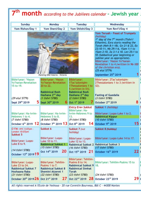 7 month according to the Jubilees calendar - Jewish year 25 Elul 5779 to 25 Tishri 5780 - Sept 25 to Oct 24 2019