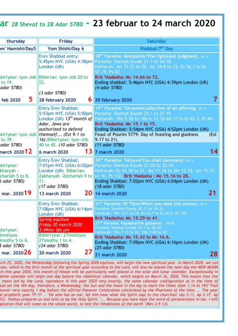 12 month according to the Jubilee calendar – Jewish year 28 Shevat to 28 Adar 5780 - 23 februar to 24 march 2020