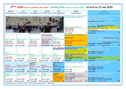 2 ème mois selon le calendrier des Jubilés - Année juive 30 nissan au 29 iyar 5780 - 24 avril au 23 mai 2020.