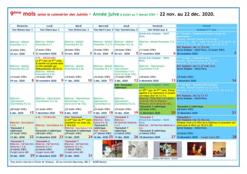 9 ème mois selon le calendrier des Jubilés - Année juive 6 kislèv au 7 thévèt 5781 - 22 nov. au 22 déc. 2020.