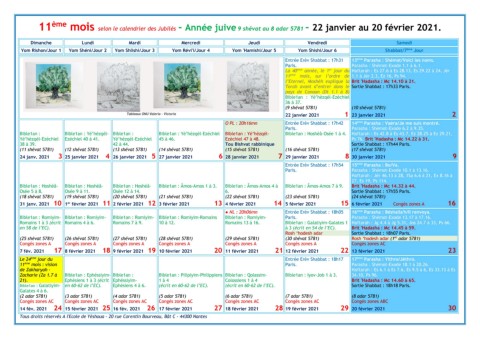 11 ème mois selon le calendrier des Jubilés - Année juive 9 shévat au 8 adar 5781 - 22 janvier au 20 février 2021.