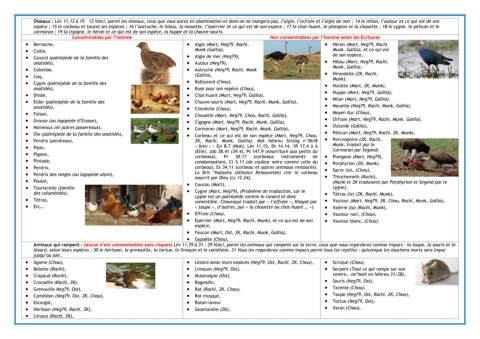 Oiseaux : Lév 11.13 à 19 : 13 Voici, parmi les oiseaux, ceux que vous aurez en abomination et dont on ne mangera pas, l’aigle, l’orfraie et l’aigle de mer ; 14 le milan, l’autour et ce qui est de son